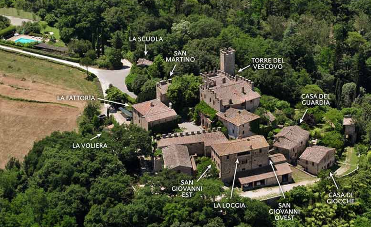 The castle has 10 private villas and apartments, with a total of 22 en-suite rooms, accommodating up to 45 guests. It also has a private chapel, banquet room, outdoor swimming pool, and tennis court.